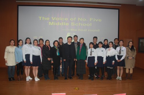“郑州五中好声音”由高中英语组发起、校团委学生社团组织的每年举办一次的英语歌曲学生表演活动,一般安排在当年的圣诞节来临之际。高中英语组同仁共同进一步完善了《“寻找五中好声音”参赛细则》,并通过海报宣传发动,寻找五中好声音苗子,经过一个月的海选预赛、年级复赛等精心策划和细心准备,顺利结束。参与评委的老师还有郭雪玲、李峥域、尹少修、谷冰冰、李海江、孟华、李靖等英语老师和高三学生朱正担任评委。